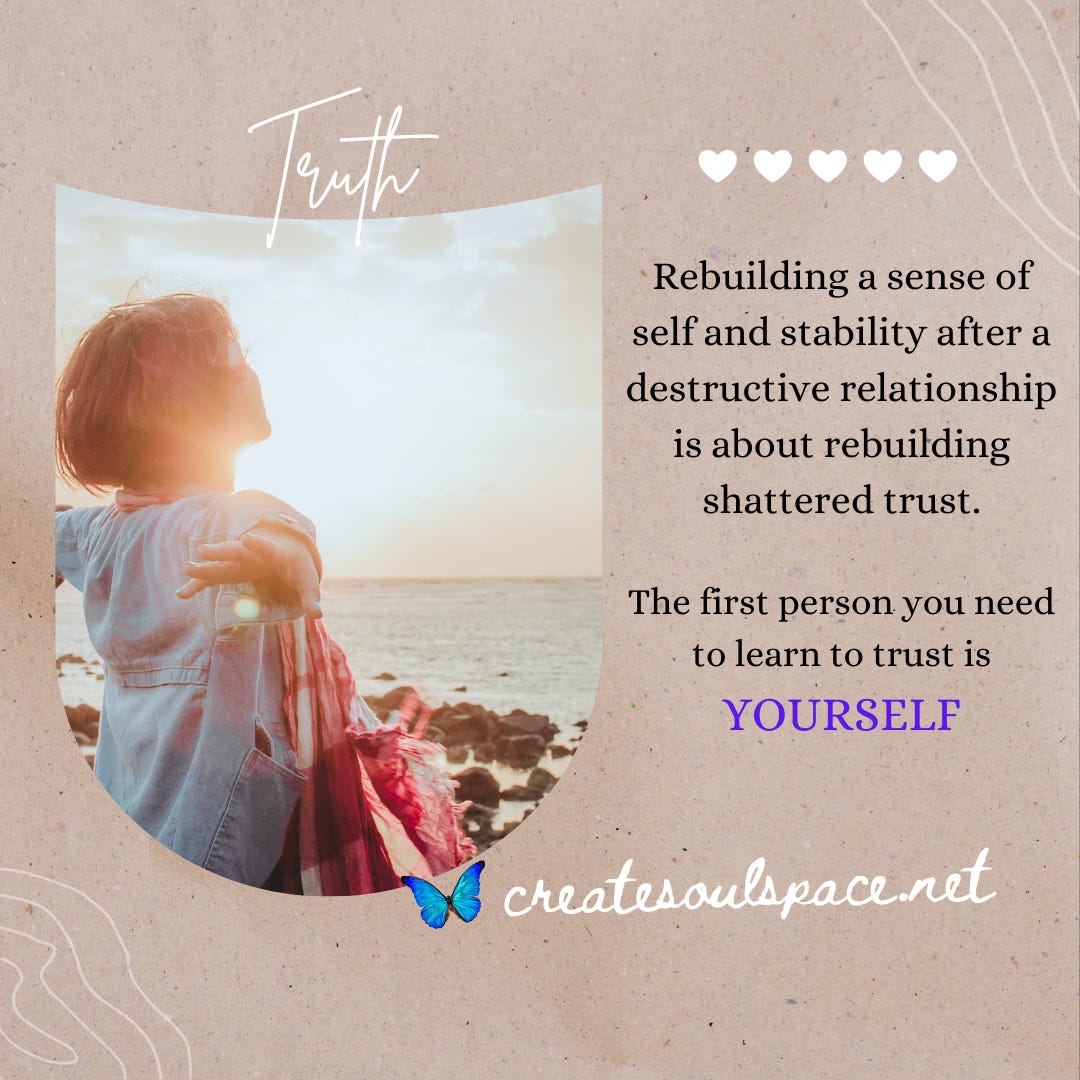Stop listening to the voice of your abuser and start listening to the Voice of the Spirit, who is internally guiding you. Calm your nervous system through prayer, deep breathing, and reaching out for help. Connect with supporting and informed loved ones, a trusted spiritual resource, or professional therapeutic help. Be not afraid. Self-love and self-care will begin the process of regaining self-trust.